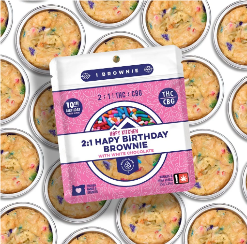 We’re celebrating ten years of award winning artisanal edibles with the release of our game changing Hapy Birthday Brownie. White chocolate lover’s rejoice, this new brownie replaces the standard chocolate with velvety white chocolate. These soft and fudgy white chocolate brownies have a crisp top, a gooey center, and the addition of fun pops of color from the rainbow sprinkles. The lush, rich flavor of white chocolate is complemented by the infusion of uplifting THC and CBG effects.